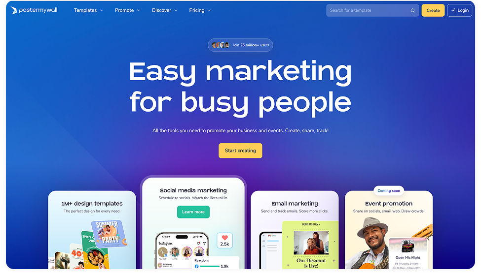 PosterMyWall is an all-in-one marketing platform that combines social media scheduling with professional design tools, email marketing, video creation, and even digital signage. It's best suited for small businesses and organizations that need to handle both content creation and distribution without juggling multiple tools.